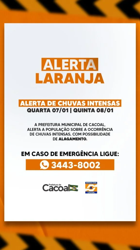 A Prefeitura de Cacoal emitiu alerta laranja para a ocorrência de chuvas intensas nesta quarta-feira (7), com validade também para a quinta-feira (8). O comunicado indica risco de alagamentos e orienta a população a adotar medidas preventivas, especialmente em áreas mais vulneráveis.