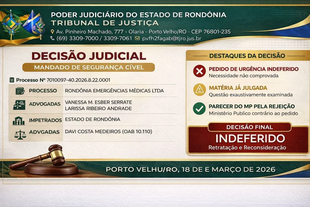 Na decisão, o magistrado rejeitou os pedidos apresentados tanto pela UNI SOS Emergências Médicas Ltda. quanto pelo Estado de Rondônia, que buscavam reverter a suspensão. As solicitações de retratação e reconsideração foram indeferidas de forma expressa, mantendo os efeitos da liminar em vigor.